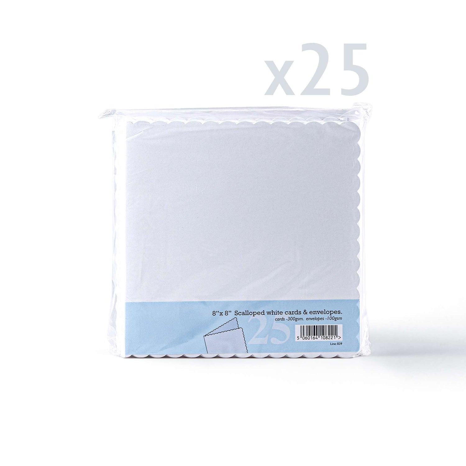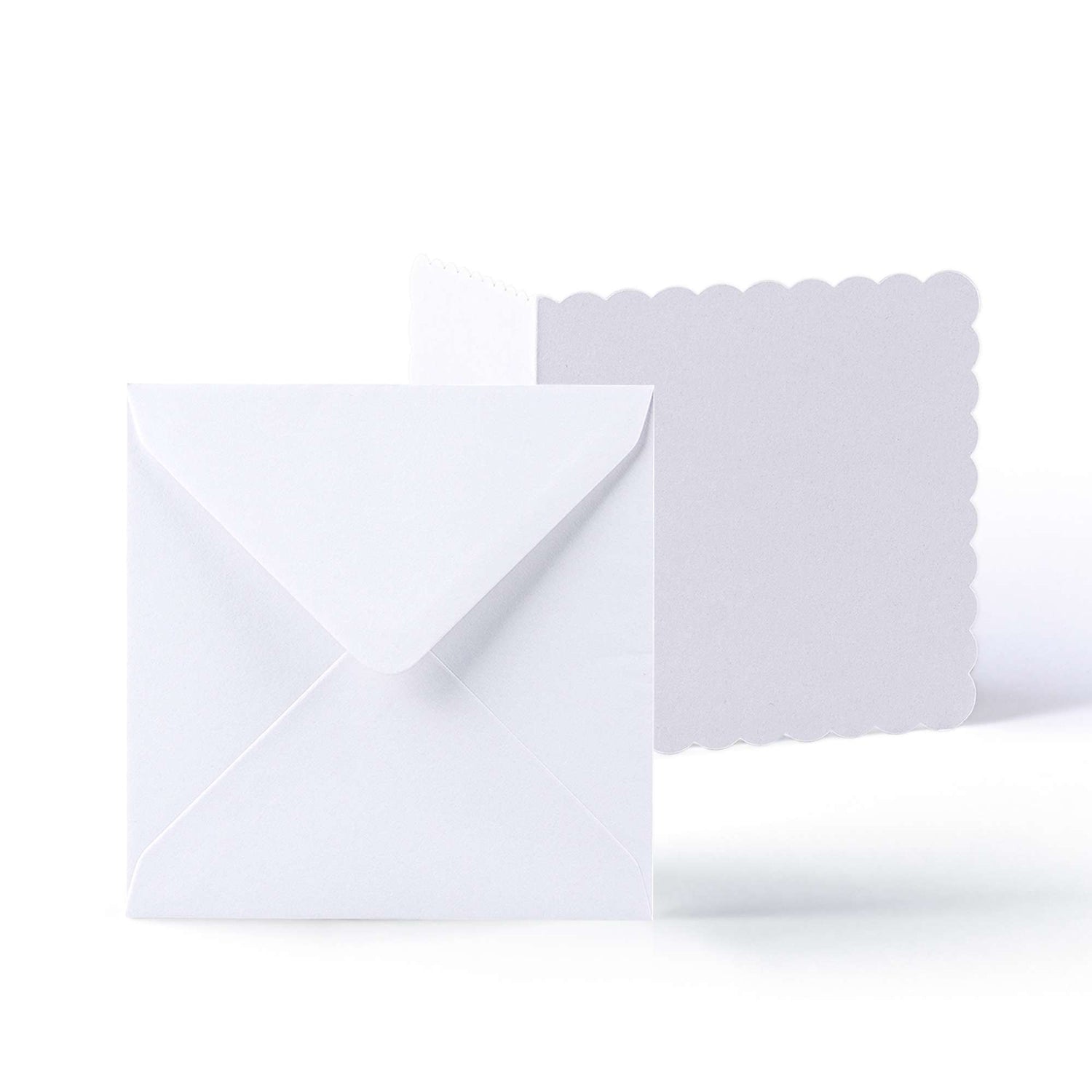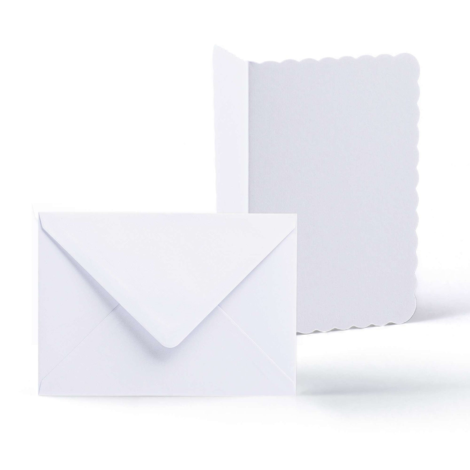 Set elegante composto da biglietti bianchi con bordo smerlato (300 g/m²) e buste abbinate (100 g/m²).
